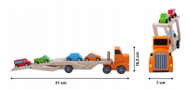 Sada obsahuje tahač s návěsem a 4 barevné autíčka. Návěs má funkci skládání, díky níž auta při nakládání najíždění na návěs jeden po druhém. Návěs se během přepravy zvedne.