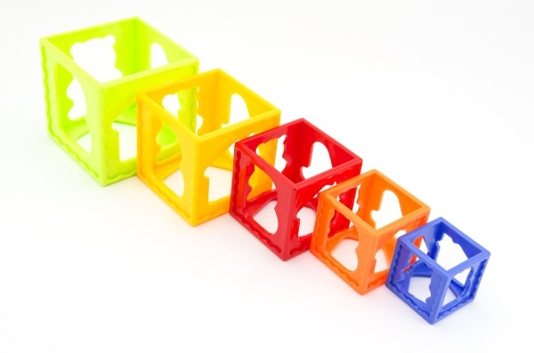 Děti si mohou postavit pyramidu z kostek, které nemají plné boky. Sada obsahuje 5 ks plastových kostiček různé velikosti od nejmenšího po největší, v krabičce.