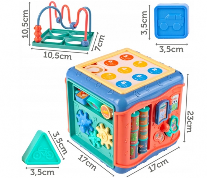 Pestrobarevná multifunkční hračka, která podporuje rozvoj dětské motoriky a logického myšlení. Dítě se učí rozpoznávat tvary a barvy.