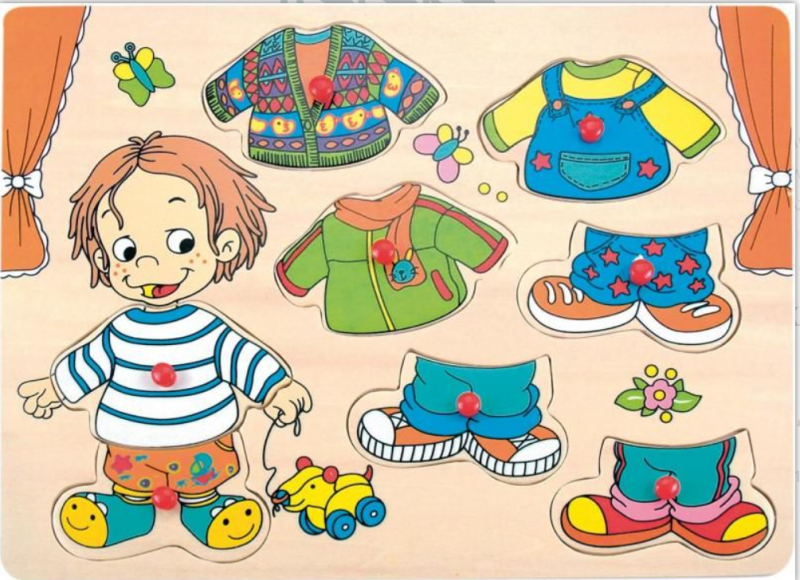 Osmidílná vkládačka trénuje koordinaci ruka-oko. V šatně Karolínky je celkem 8 hádanek – hlavolamů. Dítě se snaží najít správnou dvojici a umístit jej do správného otvoru.
